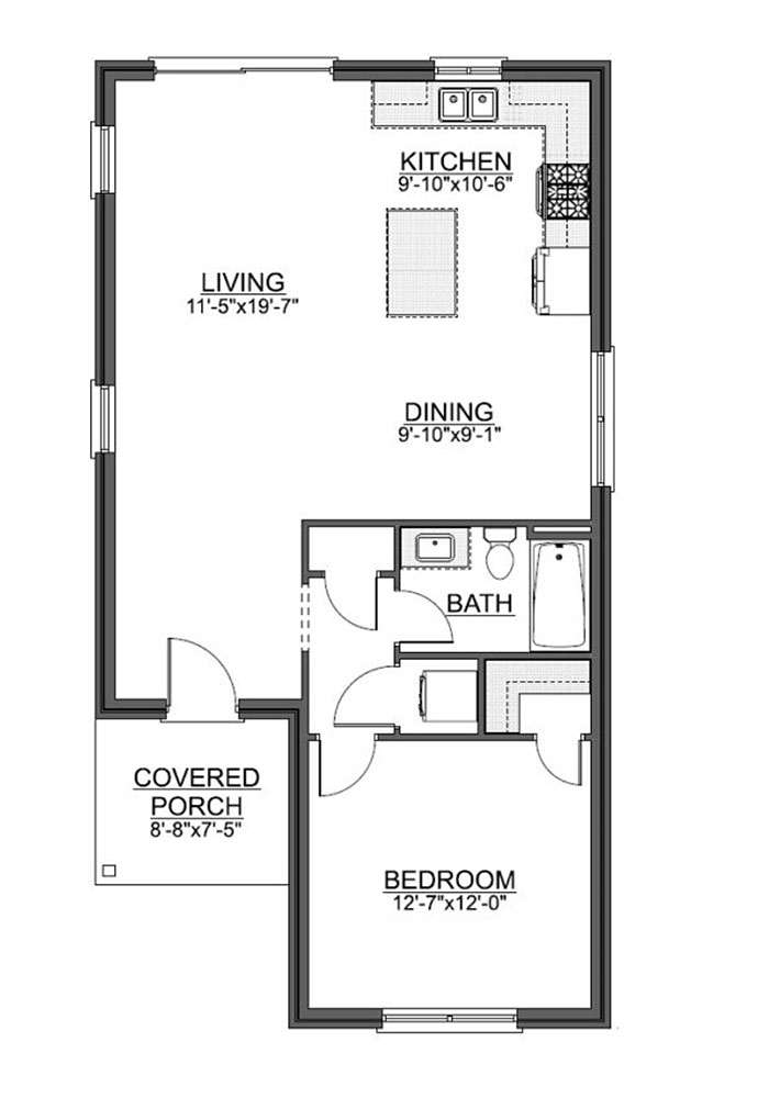 This 875-square-foot tiny home maximizes space and functionality while offering a comfortable living experience. The layout features a cozy one-bedroom, ideal for relaxation and rest. The home includes a convenient laundry closet, discreetly tucked away for easy access. The three-piece bath is modern and efficient, equipped with a shower, toilet, and sink, offering everything you need in a compact space. The heart of the home is the open-concept kitchen, seamlessly blending with the dining and living areas, creating a spacious, airy feel. This tiny home design is perfect for those seeking a functional, efficient, and stylish living space with all the comforts of a traditional home in a compact footprint.