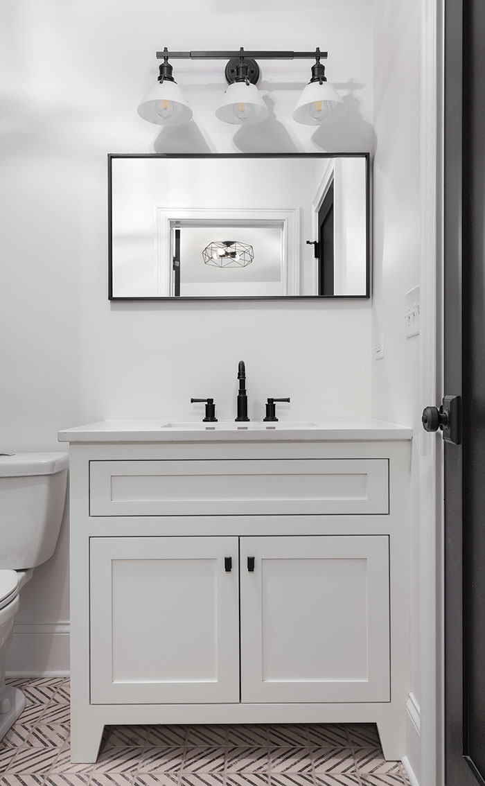Other decor considerations include the light fixture, mirror, towel rack and faucet. Because it’s a small room, these items should co-ordinate with each other but not necessarily match.