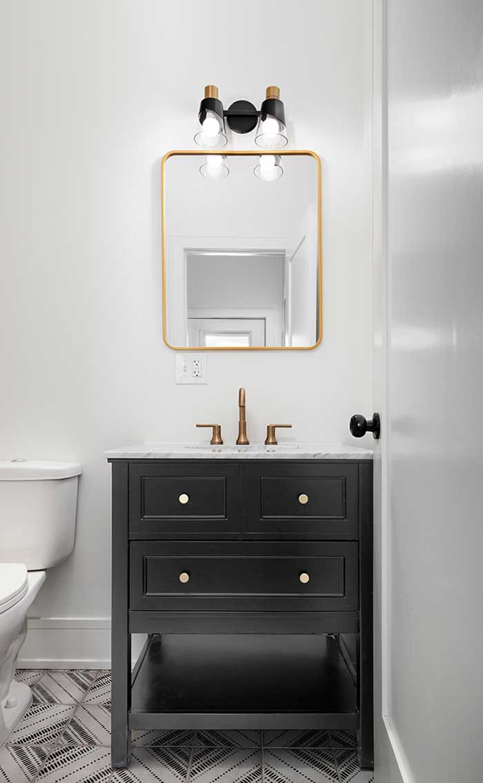 Osez utiliser une couleur pour le meuble-lavabo que vous choisirez ou peut-être un carrelage à motifs sur le plancher. Vous pouvez aussi jouer la carte de la sécurité avec les éléments plus permanents de la pièce et opter pour une couleur vive sur les murs. L’ajout de lambris ou de shiplap aux murs donnera à votre salle d’eau un aspect traditionnel, tandis que le placage de pierre derrière le meuble-lavabo lui confèrera un style contemporain.