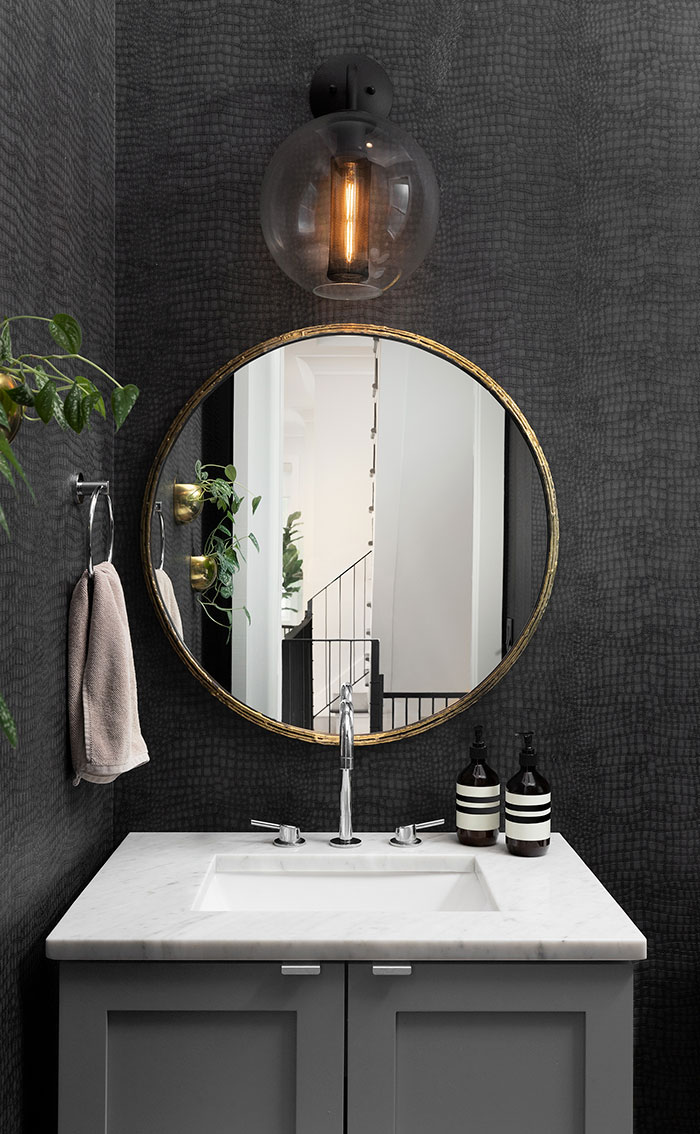Le choix d’une couleur de métal, comme le noir mat ou l’or bruni, permettra de les relier visuellement. Les salles d’eau ne sont pas sujettes à une forte humidité comme la salle de bains principale, c’est donc un endroit idéal pour exposer des oeuvres d’art sur les murs.