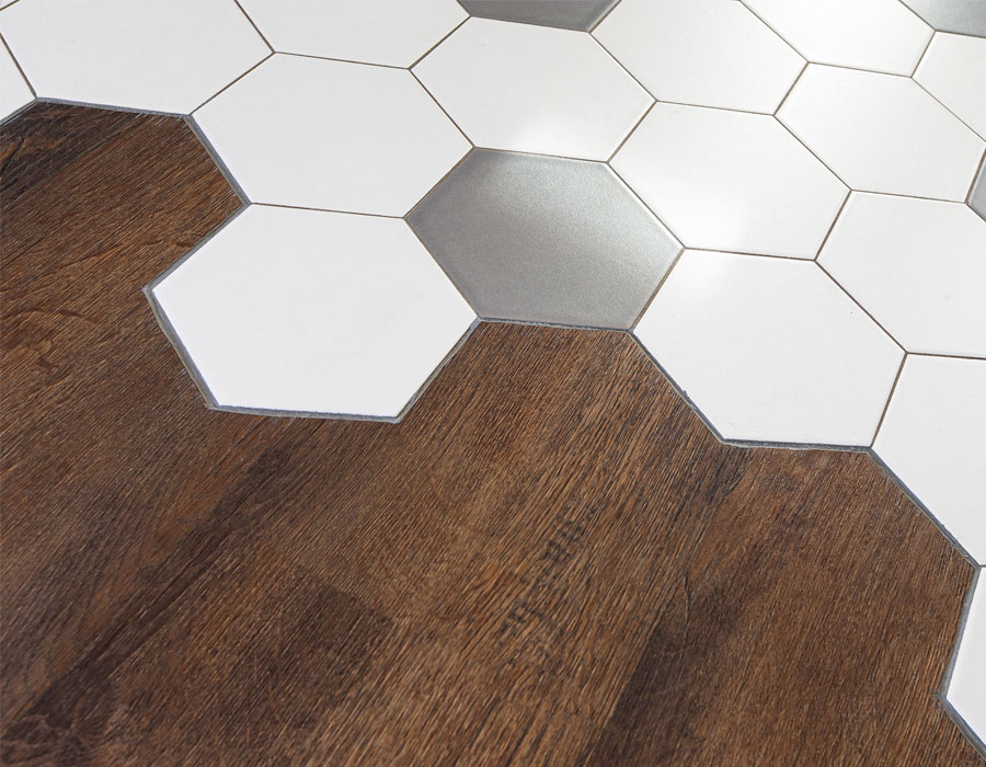 Enfin, une autre option consiste à concevoir un plancher de transition où bois et carrelage se fondent l’un dans l’autre. Cette technique est souvent utilisée pour délimiter des zones dans une même pièce, mais elle est rarement appliquée dans les entrées. Ce type de plancher exige une planification minutieuse. Il est conseillé de poser les carreaux à sec au préalable pour visualiser le motif. Si vos revêtements ont des hauteurs différentes, cela doit être pris en compte dès la phase de planification. Les carreaux hexagonaux conviennent particulièrement à cette technique : ils doivent d’abord être collés, puis le plancher en bois découpé pour s’ajuster autour.