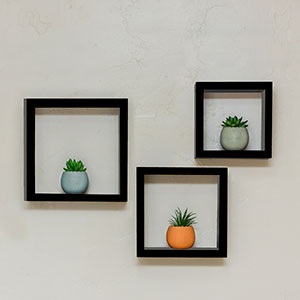 Add style to your walls and showcase your collections with decorative shelving from Onward. The TriCube Shelf consists of three cubes 10″ x 10″ x 3.5″, 8″ x 8″ x 3.5″ and 6″ x 6″ x 3.5″, and the Hashtag Shelf is a stylized hashtag symbol, 26.5″ x 26.5″ x 5″.